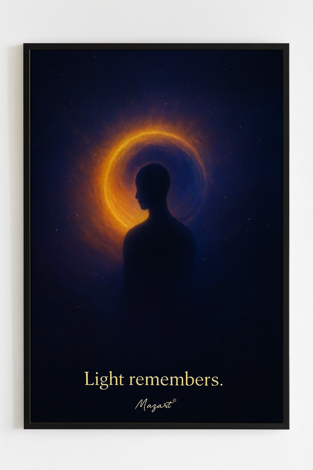 “Light Remembers” insan zihninin derin sessizliğini kozmik bir ışıltıyla birleştiren etkileyici bir eser. Silüetin arkasında beliren altın halka, hem içsel aydınlanmayı hem de evrenle olan görünmez bağı simgeliyor. Minimalist kompozisyonu ve güçlü renk geçişleriyle, meditasyon, farkındalık ve spiritüel sanat sevenler için huzur veren bir dijital poster.