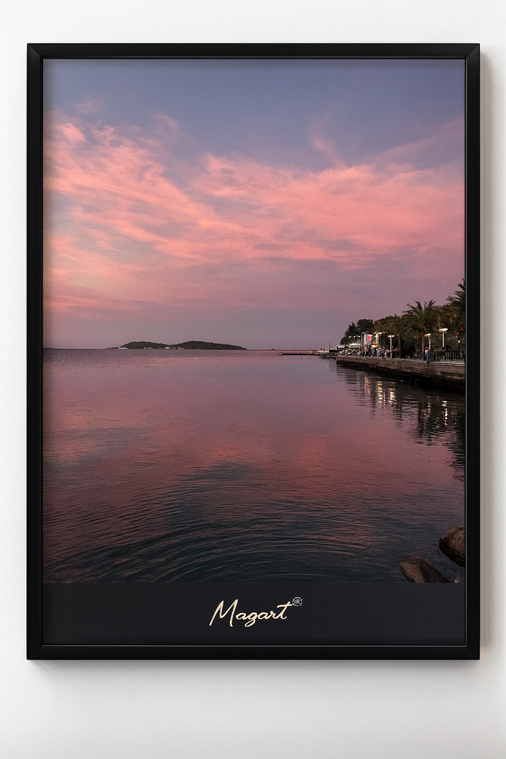 Ege’nin sakin ritmiyle gün batımının geçici renklerini bir araya getiren bu çalışma, Urla sahilinde pembe ile mavi arasında asılı kalan bir anı kaydeder. Gökyüzünün yumuşak geçişleri, kıyıya usulca vuran dalgalar ve ufukta silikleşen ada formları, sahil boyunca beliren ışıklarla birlikte zamansız bir dinginlik hissi oluşturur.